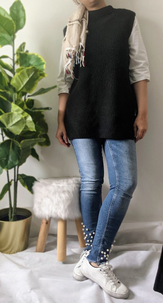 This may just well be my ultimate ‘time of the month’ look. Nothing more comfortable than a pair of trainers, skinny jeans and a nice warm oversized sweater vest.