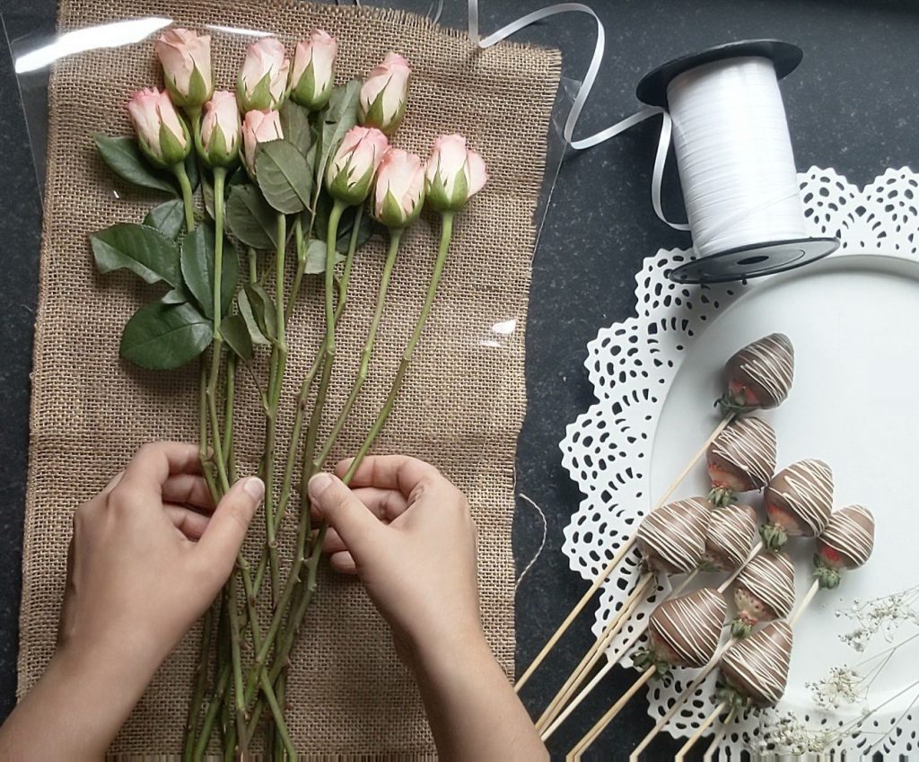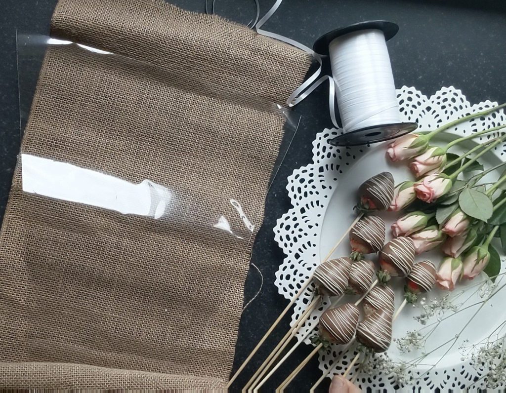 For this you can use Hessian fabric, or brown paper or Evan a newspaper, make sure that this is slightly longer than the roses, (I have also put a plastic sheet on top of the fabric. This is optional)