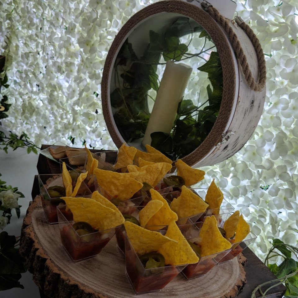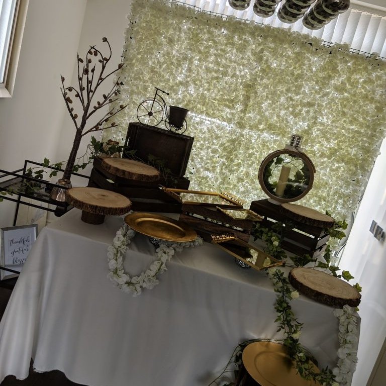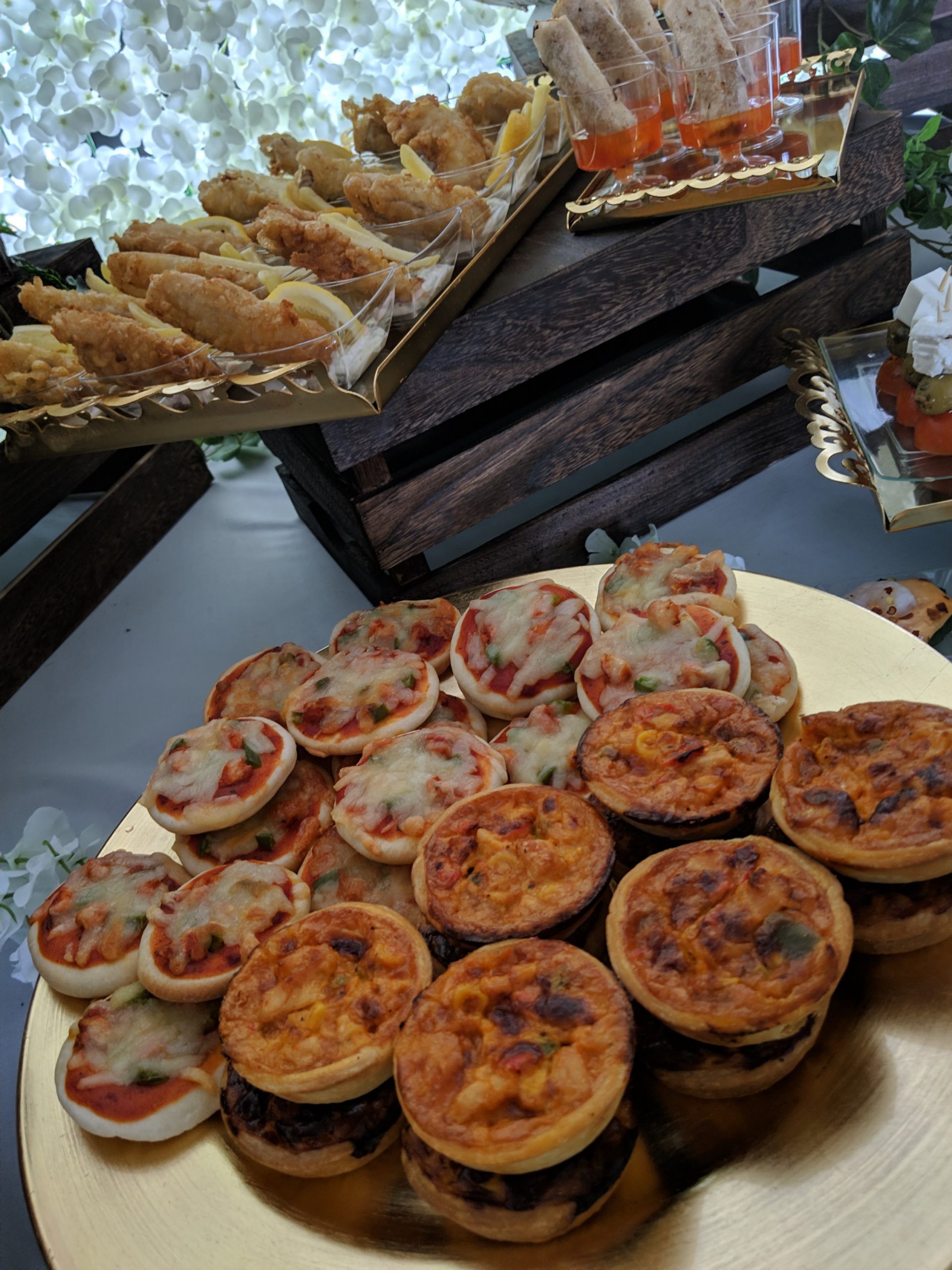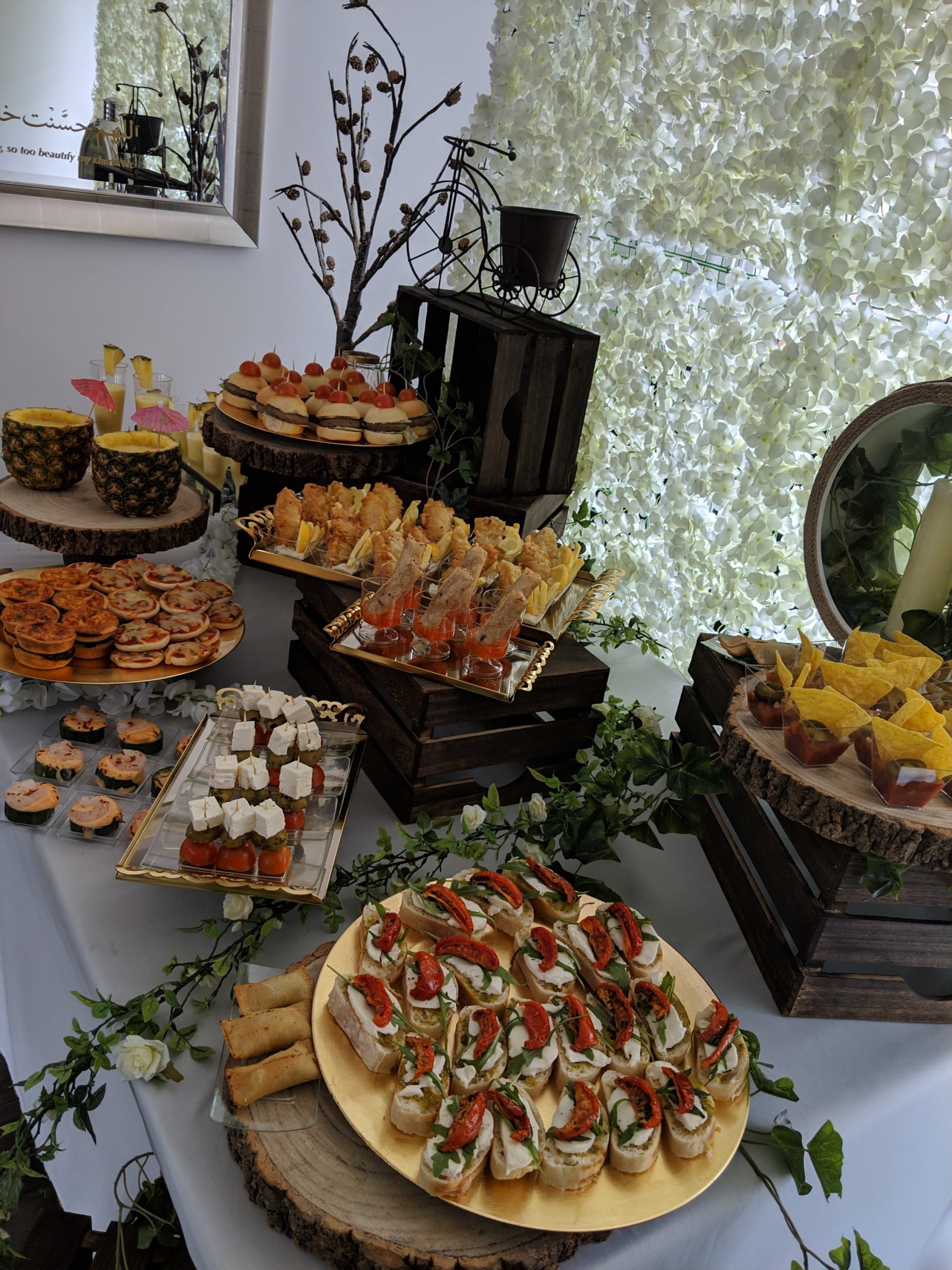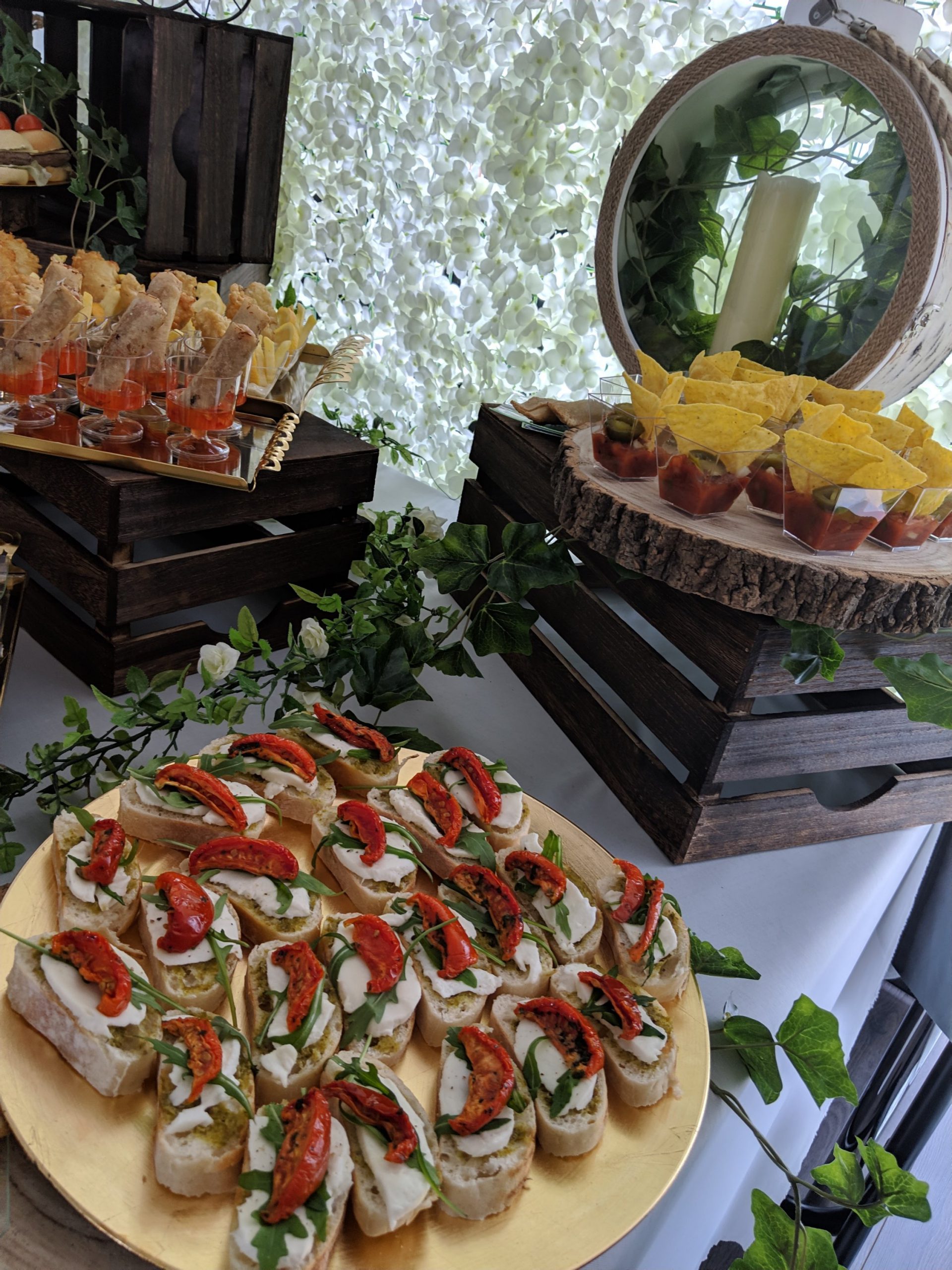 Well here is our set up, we used a backdrop with white flowers. A backdrop always make anything look so much better and it gets people guessing whether your at home or out. we used a dining table covered with a white sheet and we went for the rustic look, so used crates, wooden logs, ivy and more floral decorations. We placed logs and trays according to the canapes we had, and just kept topping up as required throughout the day.