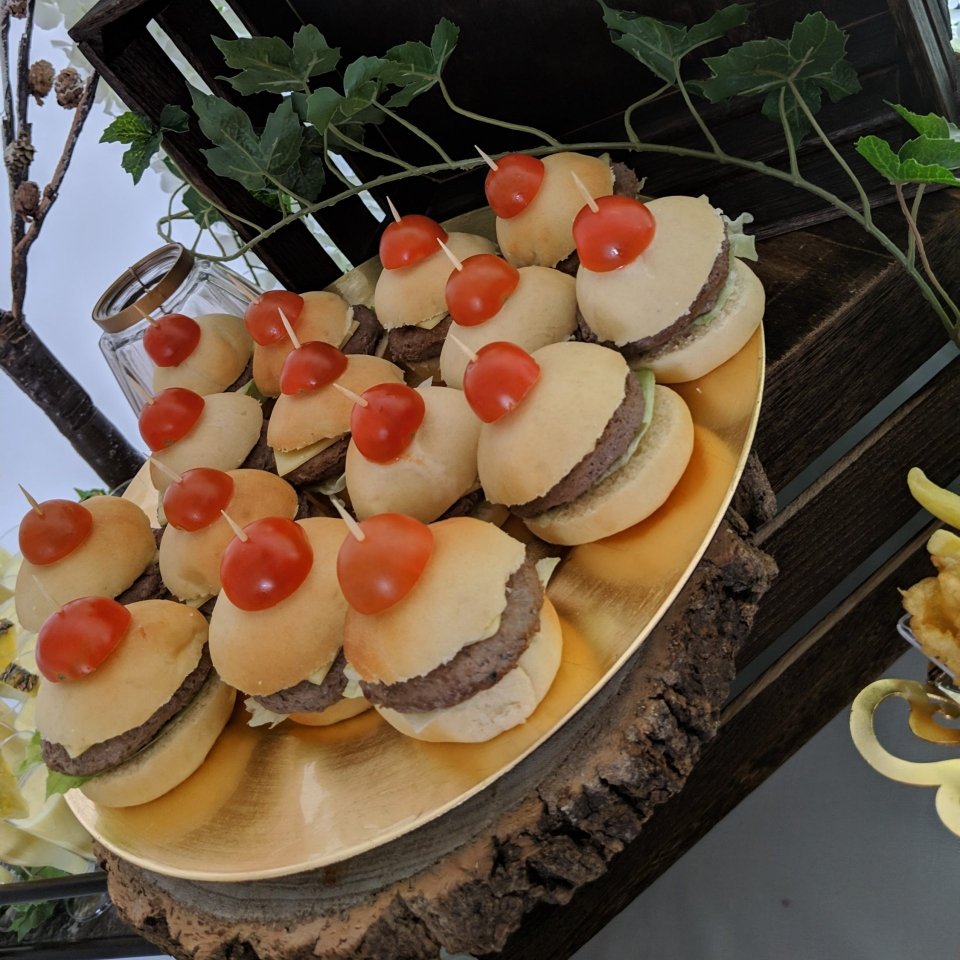 Mini Gourmet burgers. These fit in the palm of your hand, They were the cutest. The burger and the bun were both home made. Contact Afsha for more.