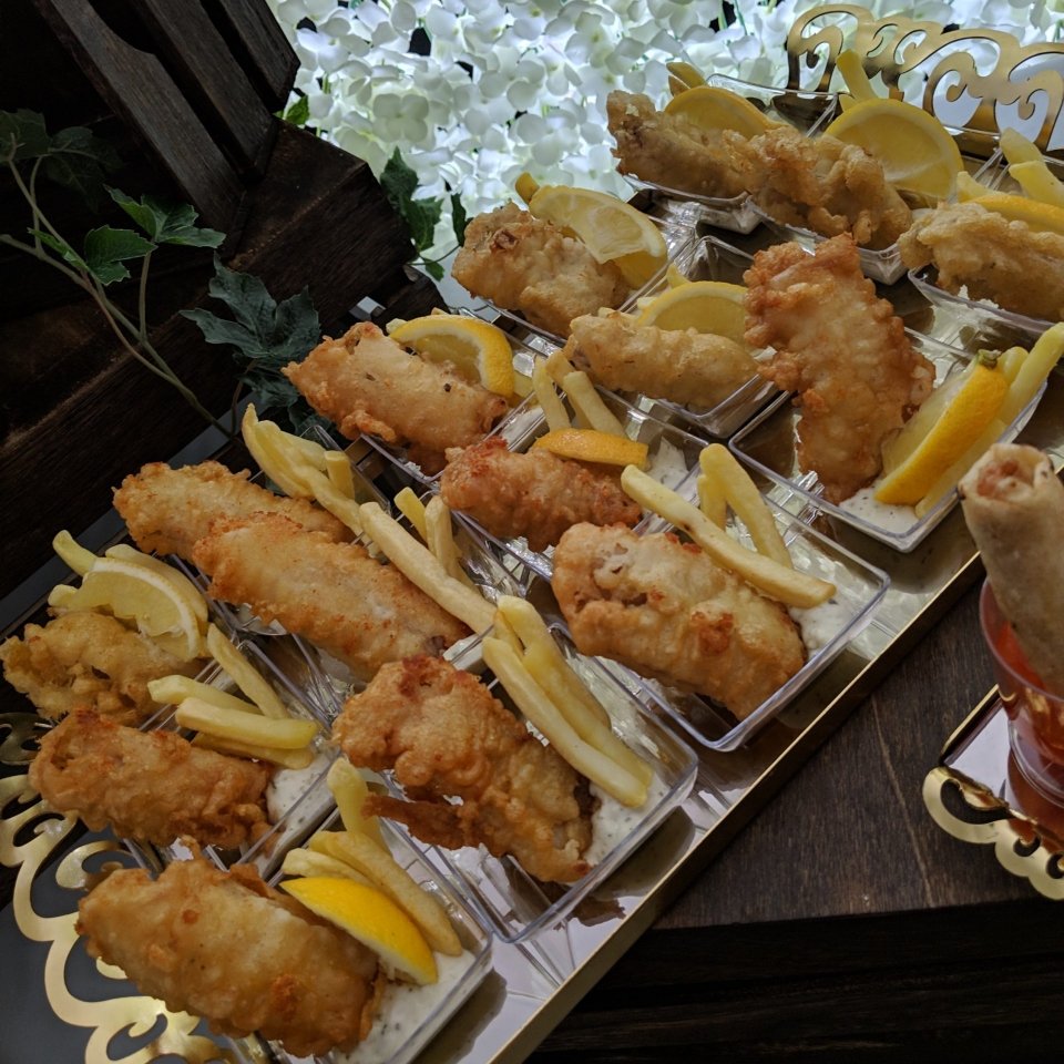 Mini Fish and Chips served with Tartar sauce in individual dessert bowls (don’t forget the lemon slice). Don’t they look a picture? It’s literally a bitesized amount….