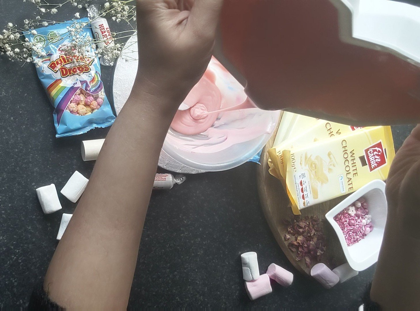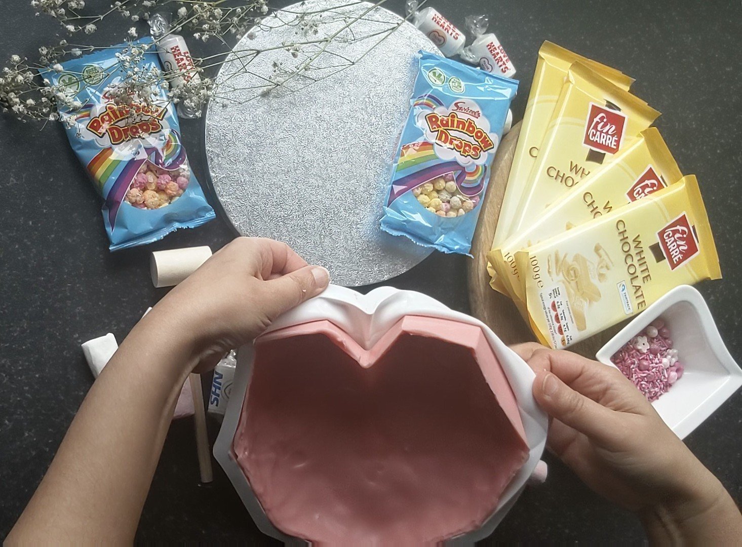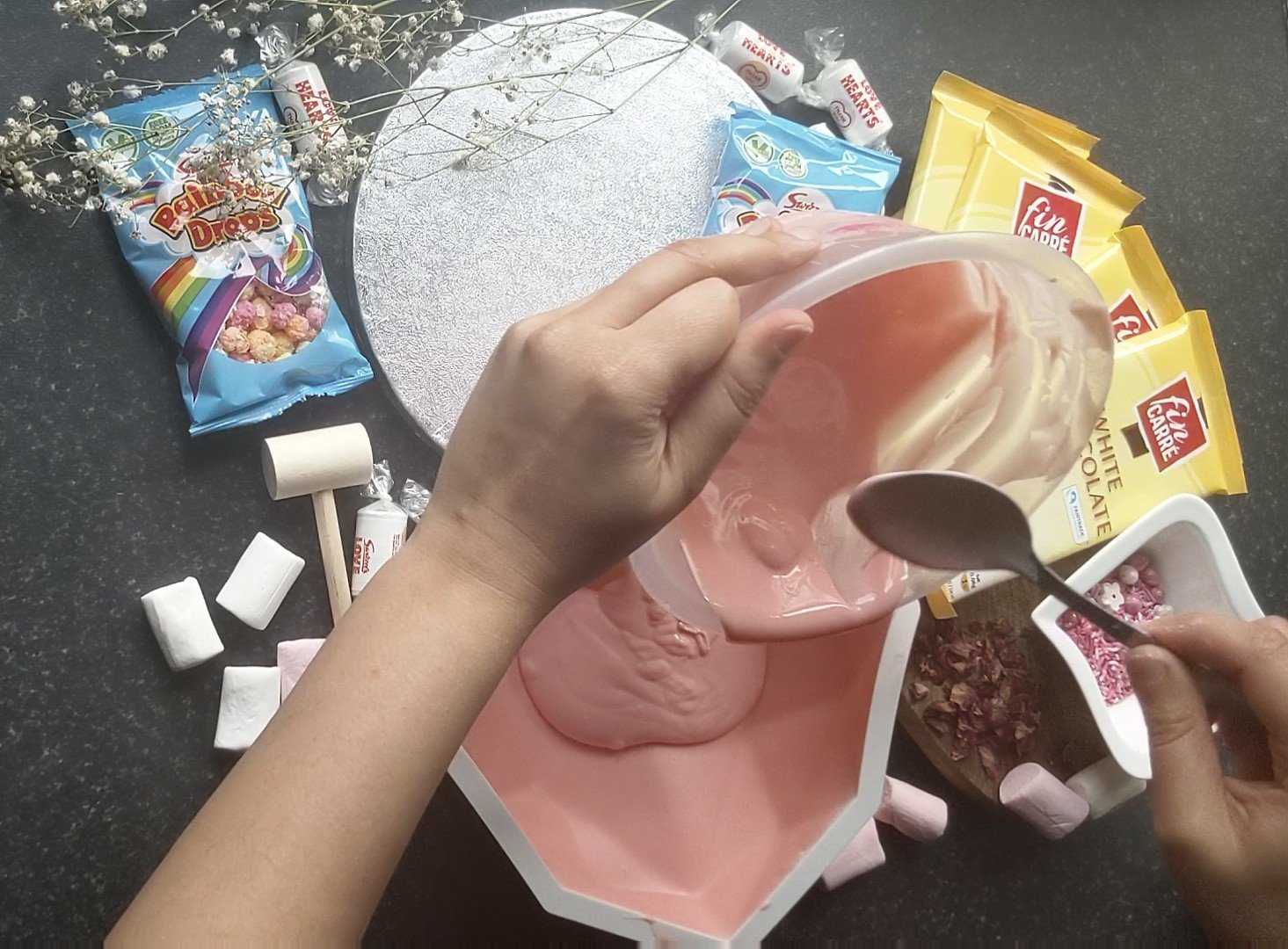 Once it has hardened add some more chocolate to the unused melted chocolate and melt again. Don’t forget to add the colour.