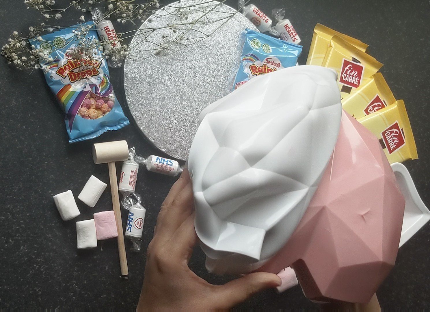 Use the cake board or tray and cover the mould and turn upside down so that all the goodies are encased inside mould.