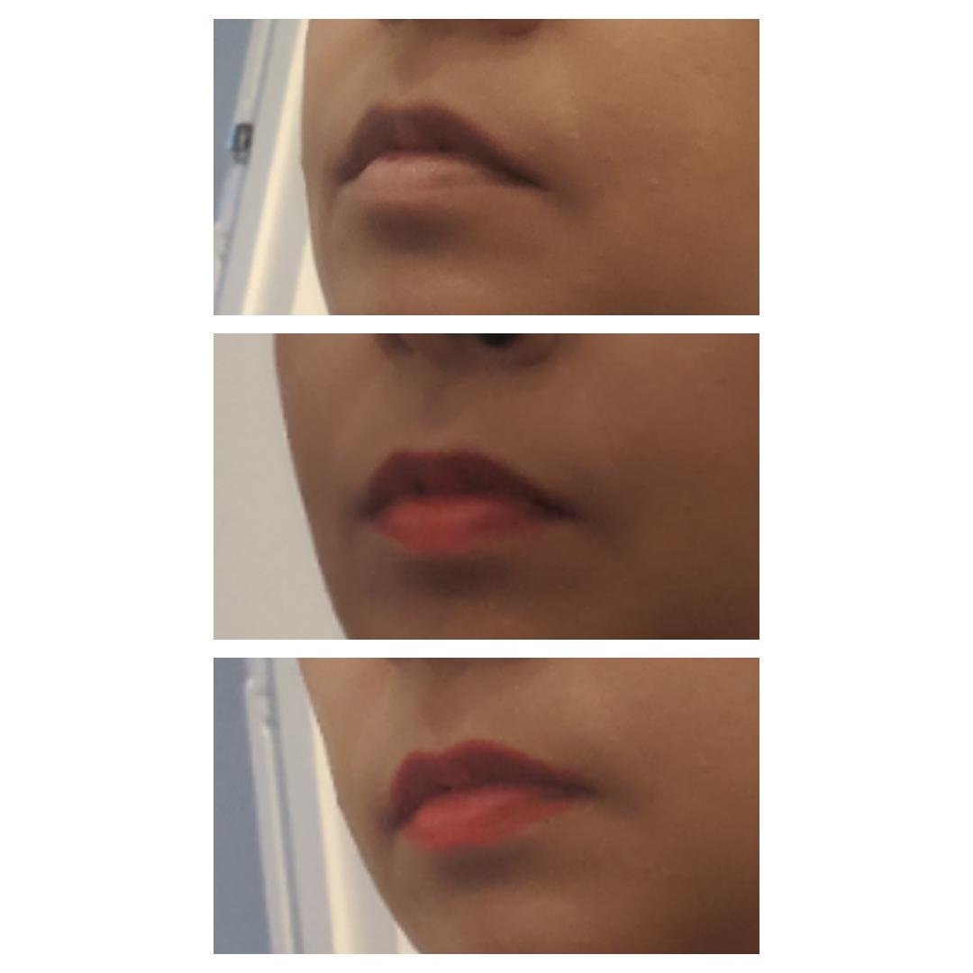 So I took photos of my lips – lipstick free, then with just lipstick and then I applied lip liner on outer edge of lips, and then the lipstick- here’s how it went: