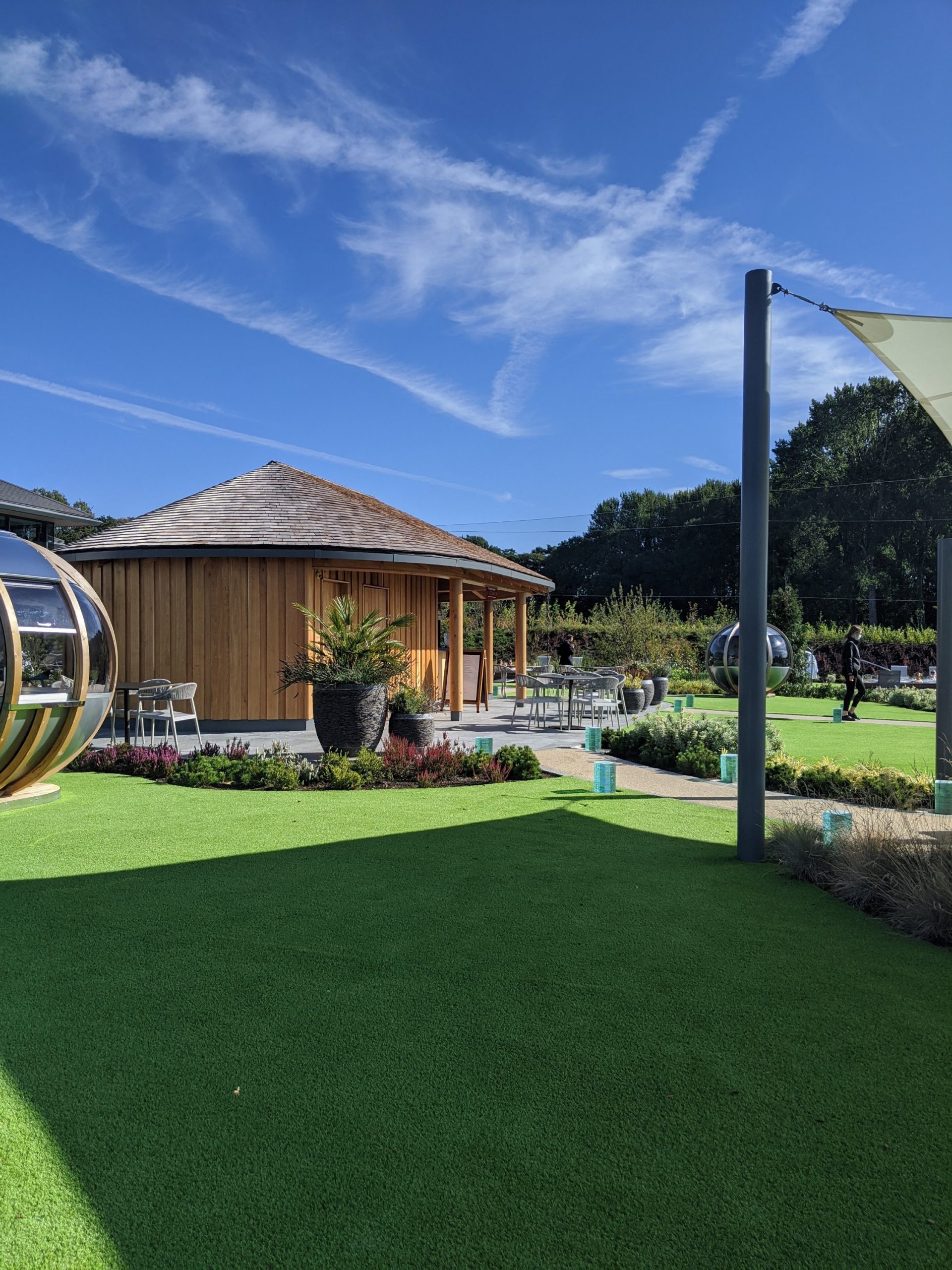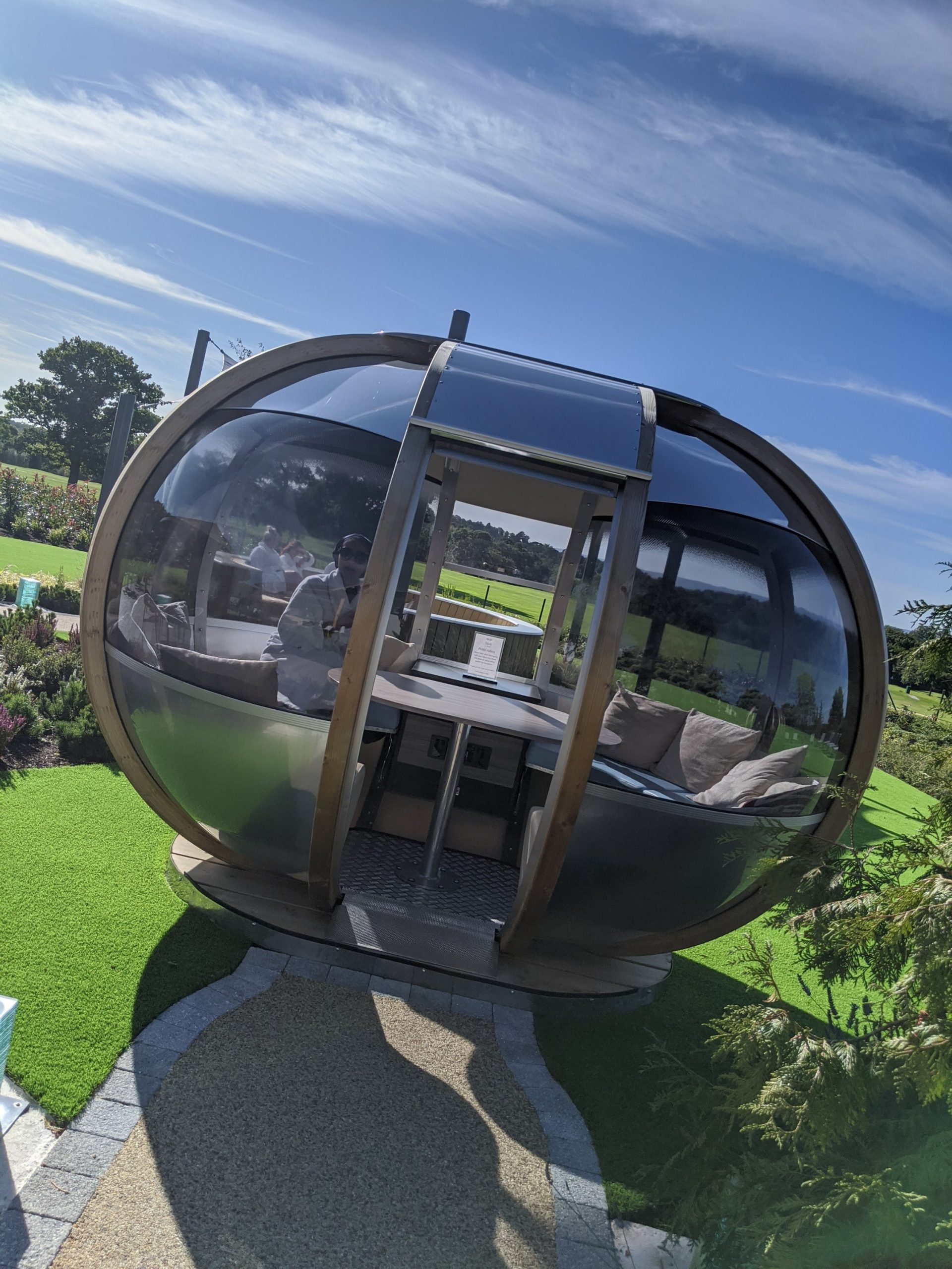 and spent a little more time inside one of many pods scattered throughout the garden, inside its furnished with comfortable sofa type seating, so warm we were sure they are heated and they had the facility to crank up the music from the bar…. *are we really in UK? another pinch needed*